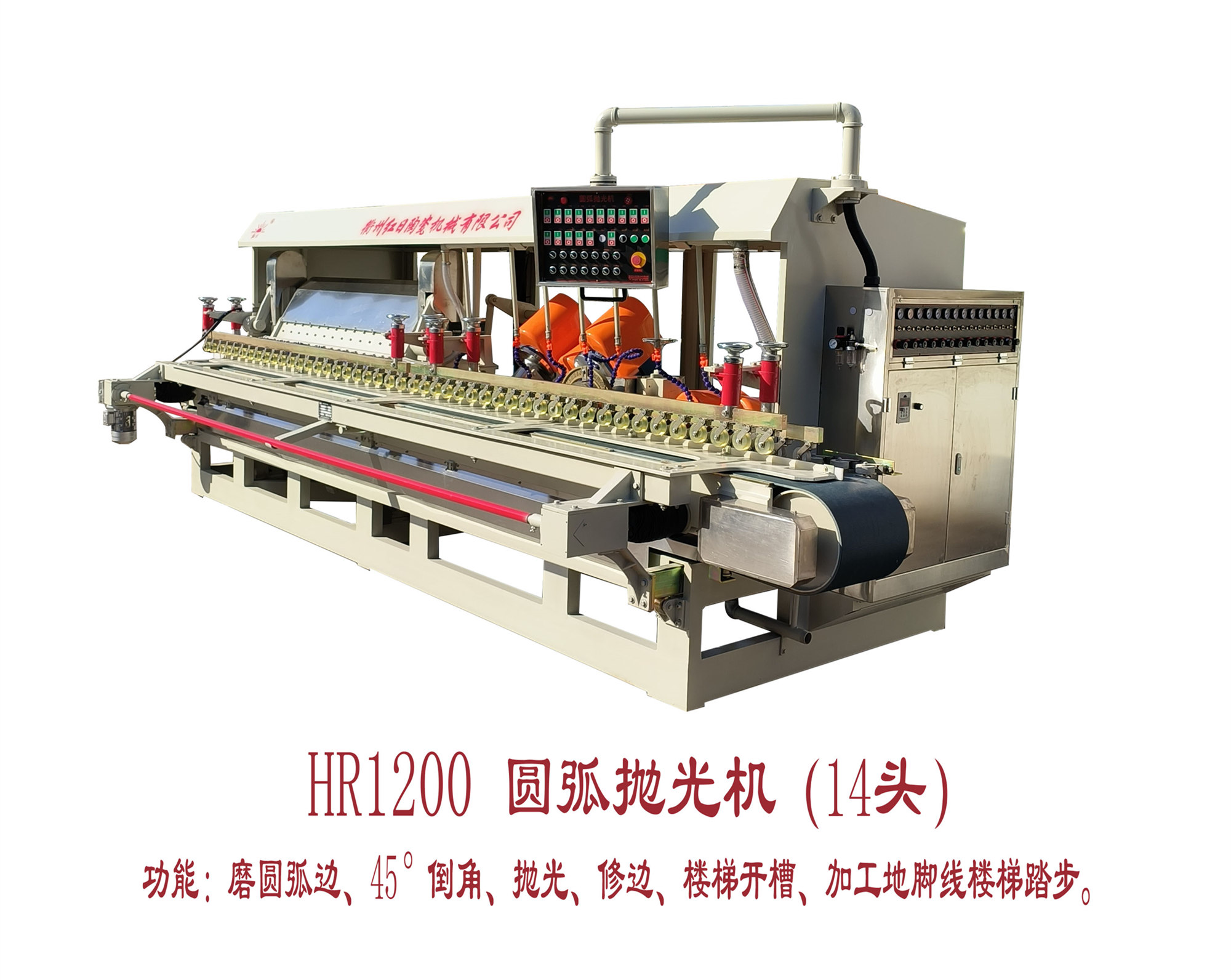 紅日牌HR-1200型圓弧拋光機,是我廠近年來結合市場上各種型號的圓弧機優缺點而改進設計生產的一種新型瓷磚加工設備。該機 結構牢固可靠,由于在大軸、搖擺機構、拋光磨頭及機械手部件等關鍵部位均采用了進口的高質量軸承,致使整機各部件運轉平穩、剛性好、搖擺位置精確、噪音 低。該機可對任何級別的拋光磚、石材進行圓弧面或45度斜面加工,使其成為靚麗的階梯磚和地腳線,生產過程全自動,操作簡便,且加工成本極低,用于裝飾工程效果極佳。